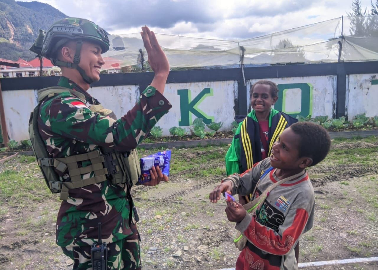 Kebersamaan Prajurit TNI dengan Masyarakat khususnya anak-anak tampak terlihat akrab saat anggota Satgas Yonif 509/BY Kostrad mengajak bermain bola serta memberikan hadiah permen, meskipun sederhana tetapi keceriaan sangat terlihat pada anak-anak Intan Jaya.